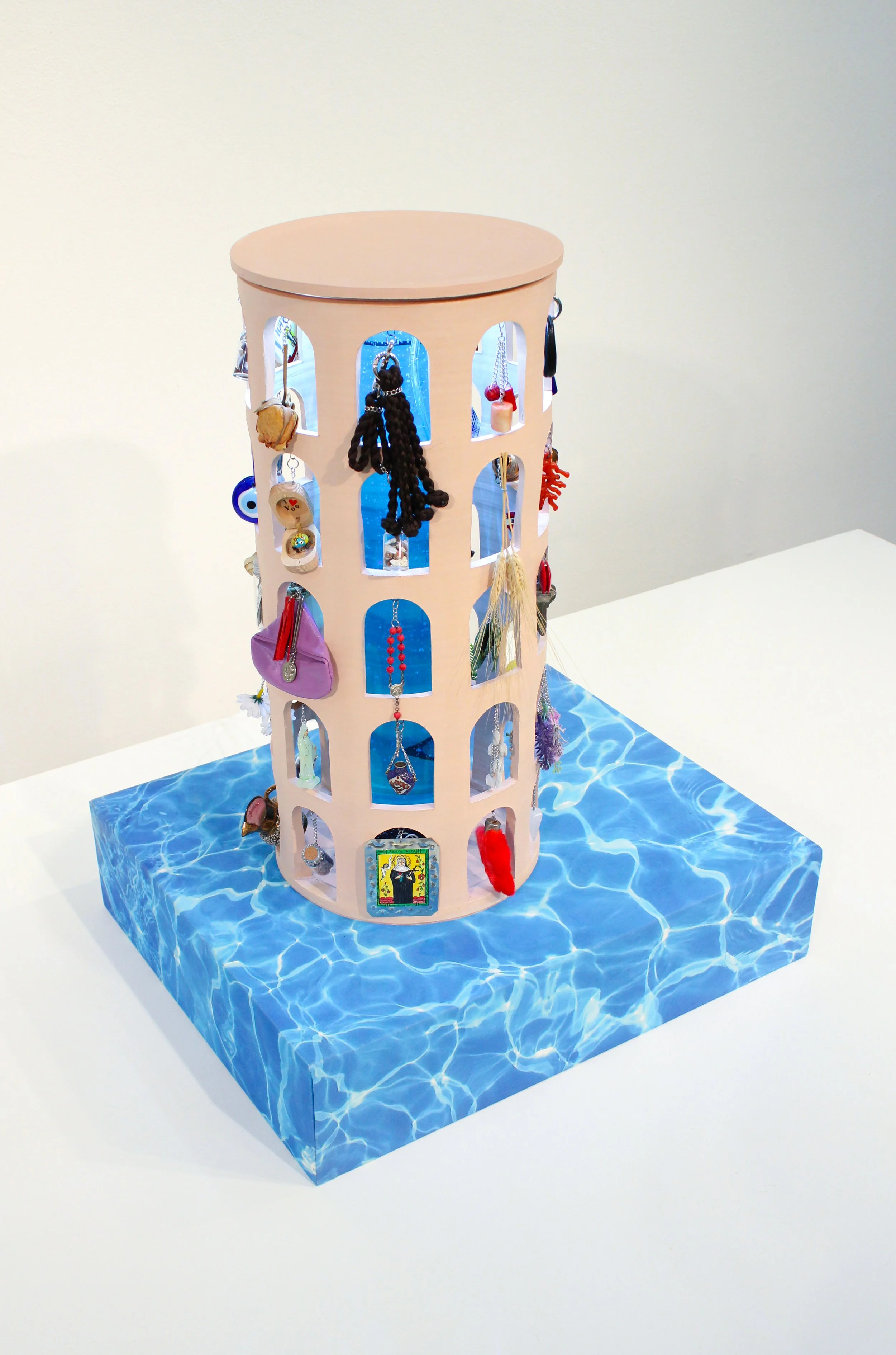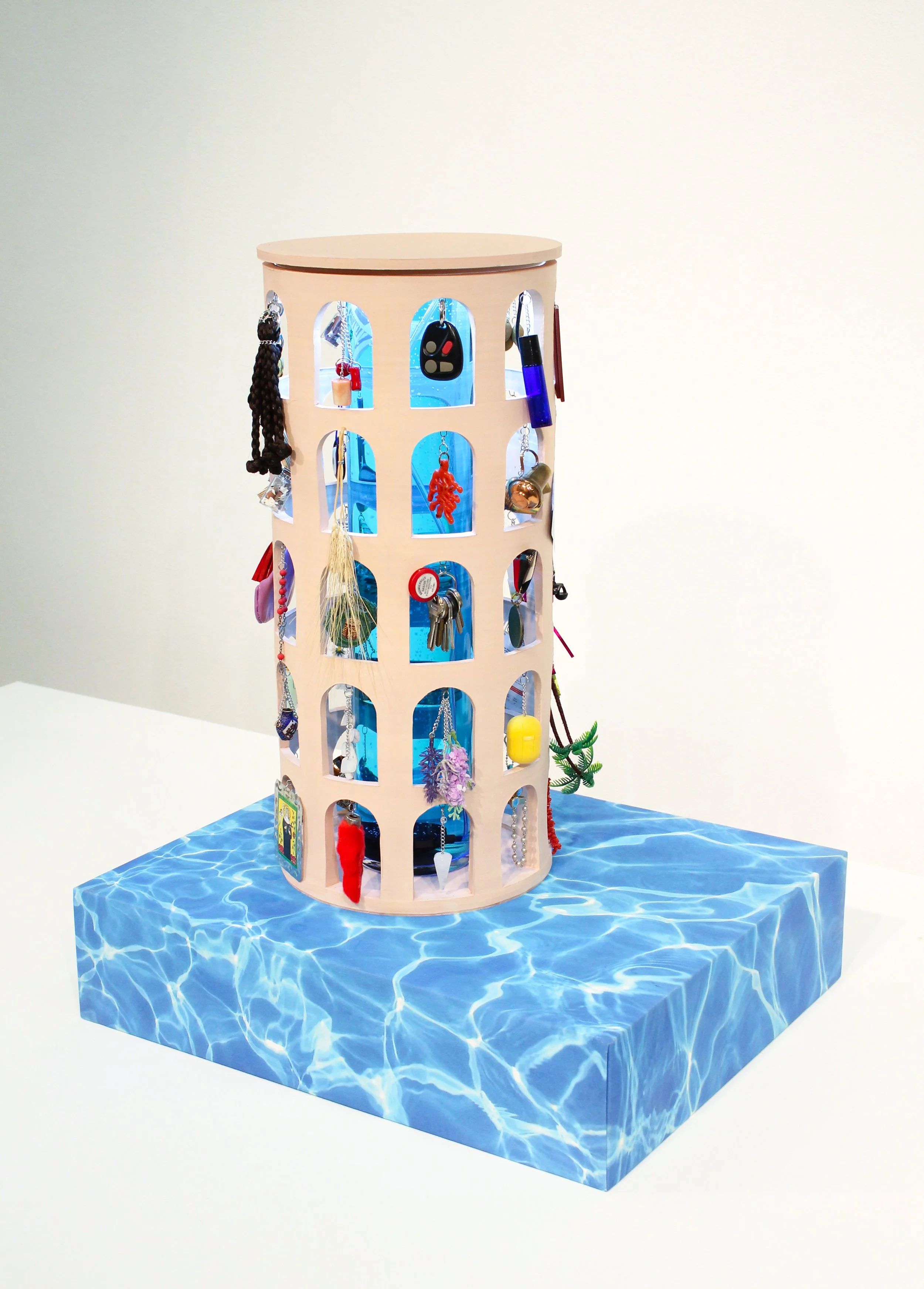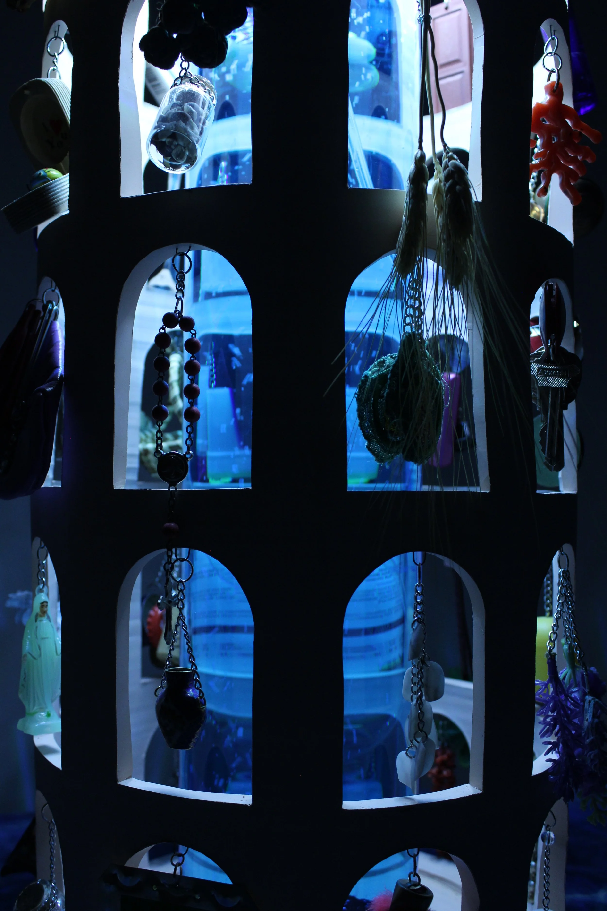 Ceramic, found objects, metal findings, glass, aquarium tubing & bubbler, water, LEDs, power sources
